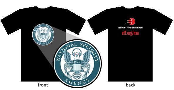 By popular demand, we are now offering t-shirts featuring our NSA logo in an exclusive offer to members only. With a donation of $65 or more you can help us continue the fight against illegal spying and receive a shirt (as well as other premiums) in return. Your support makes our work possible! Thank you!