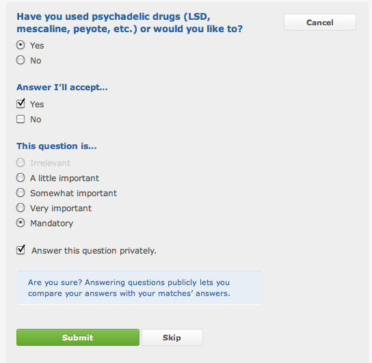 OkCupid lets users answer questions to help them improve their matches. Users are given privacy controls to answer questions "privately"—though the data is still transmitted in plaintext.