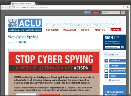 On Monday, EFF launched our Stop Cyber Spying platform featuring our new Congressional Twitter Handle Detection Tool. Users can enter a zip code in order to find their Representative’s Twitter account. Folks are then urged to tweet messages to their Representatives highlighting the invasive nature of the CISPA cyber spying bill, a vaguely written piece of legislation that would let companies bypass privacy law and share private user information with the government.