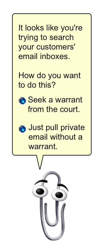 The monumental problem here is that Microsoft’s process has none of the protections provided by our legal system. No matter how fairly this process operates in any particular situation, approval by an employee paid by Microsoft, no matter how well qualified, is not approval of a “neutral and detached magistrate,” as required by the Fourth Amendment. Similarly, the protections provided to criminal suspects by the Fifth and Sixth Amendments wouldn’t apply to Microsoft’s internal investigation. In short, “Come back with a warrant” is meaningless when the FBI doesn’t get involved until after all the evidence has been collected.