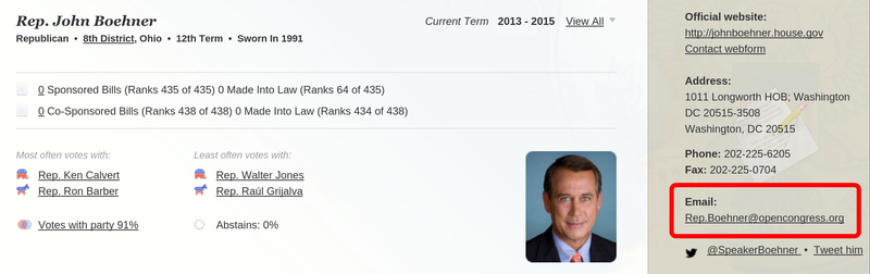 But we just wanted to be able to email our representatives like normal people. So now, if you visit a legislator's page on OpenCongress, you'll see an email address in the right-hand sidebar that looks like Sen.Reid@opencongress.org or Rep.Boehner@opencongress.org. You can also email myreps@opencongress.org to email both of your senators and your House representatives at once.