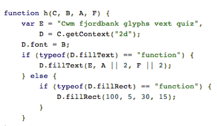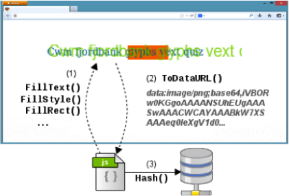 Canvas fingerprinting exploits the fact that different browsers have slightly different algorithms, parameters, and hardware for turning text into pictures on your screen (or more specifically, into an HTML 5 canvas object that the tracker can read1). According to the research by Gunes Acar, et al., AddThis draws a hidden image containing the unusual phrase “Cwm fjordbank glyphs vext quiz” and observed the way the pixels would turn out differently on different systems. This builds on a fingerprinting technique that was first presented by Keaton Mowery and Hovav Shacham in 2012.