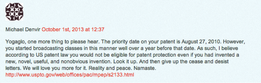 And Yoga International wasn’t the only ones who noticed that YogaGlo shouldn’t be able to get a patent. A comment on YogaGlo’s own website on the post about YogaGlo’s patent applications, dated before any patent issued, also highlighted the videos: