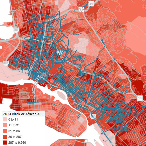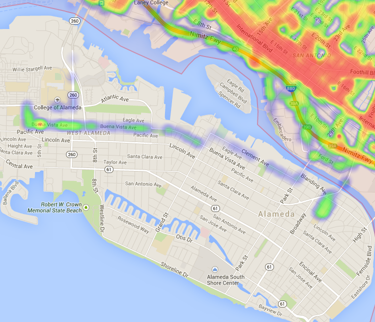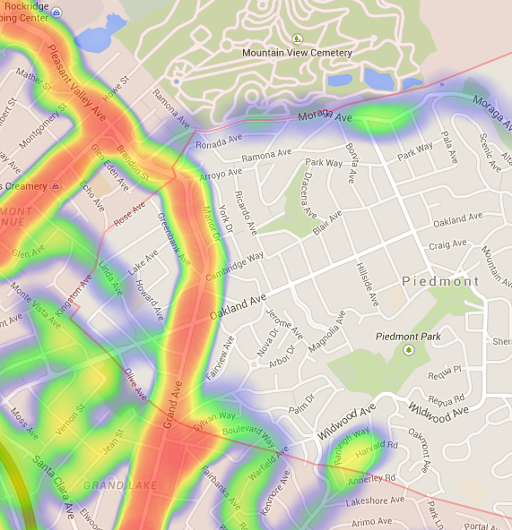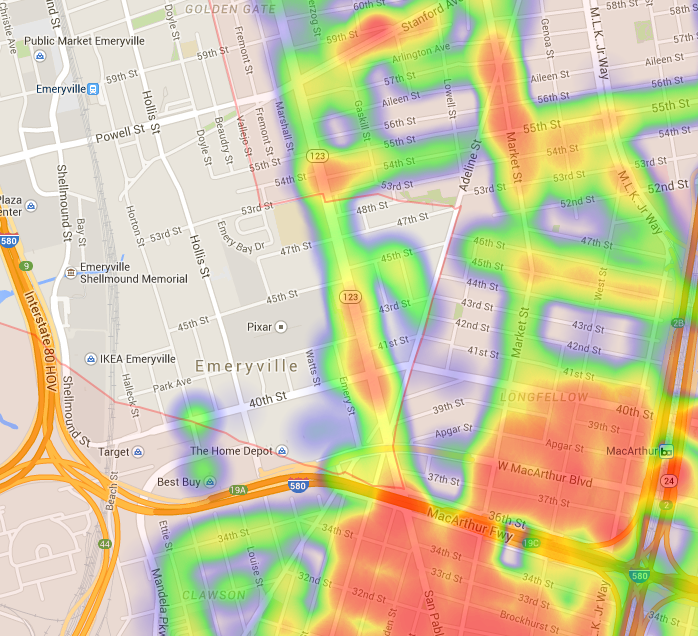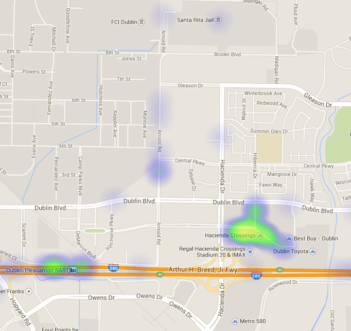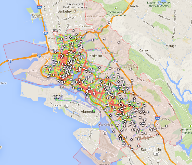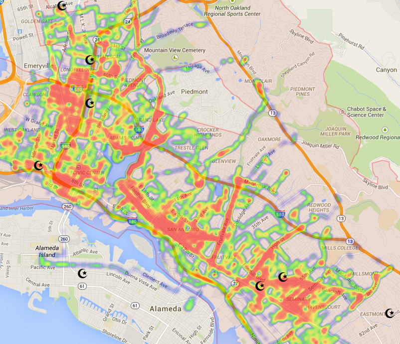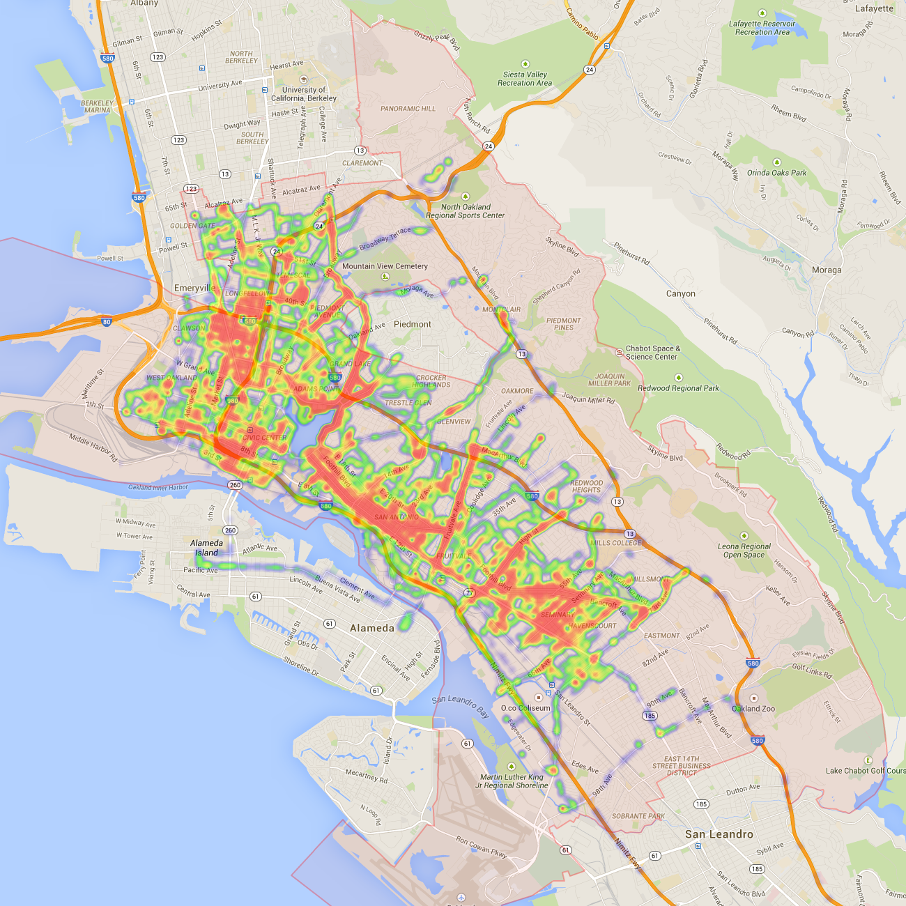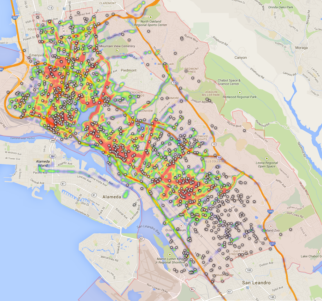 Downtown: Oakland PD headquarters is located near the corner of 7th St. and Broadway, so the increased number of hits in this area are likely due to patrol cars traveling to and from police headquarters.