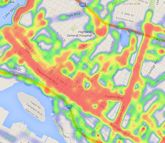 International Blvd. and Fruitvale: The same holds true for International Blvd. and Fruitvale Ave. (though some neighboring areas don’t seem to be targeted at all).