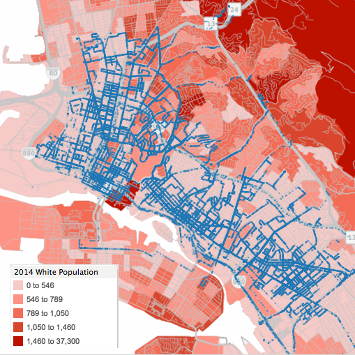 White Population: Perhaps unsurprisingly, the per-capita data and the white population data significantly overlaps. If you are driving through or parking your car in a neighborhood with a higher density of white families, you are less likely to be picked up by ALPR cameras, particularly northwest of State Highway 13.