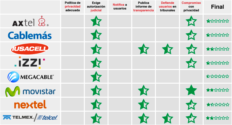 CORRECTION: An earlier version of the report showed Iusacell with a no star score in the category of Advocates for Privacy in the condensed chart. However, the category chart and the totals were correct. We've updated the condensed chart.