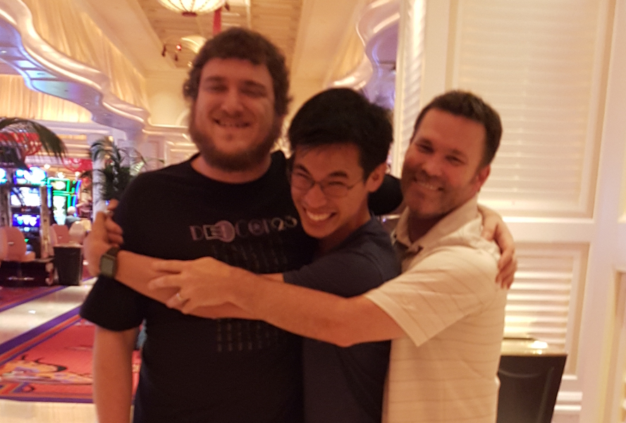 Congratulations to our three winners CryptoK, pseudoku, Elegin who successfully solved the puzzle with only minutes left of the conference! Notably, they found that if you swap rotor 2 and 3 in our puzzle you get ISRTPNHW which is an anagram for PWNSHIRT. This seasoned team also solved EFF's 2013 shirt, and won the DEF CON badge challenge for three consecutive years. Nothing brings people together quite like encryption and digital freedom. Join the resistance—encrypt all the things.