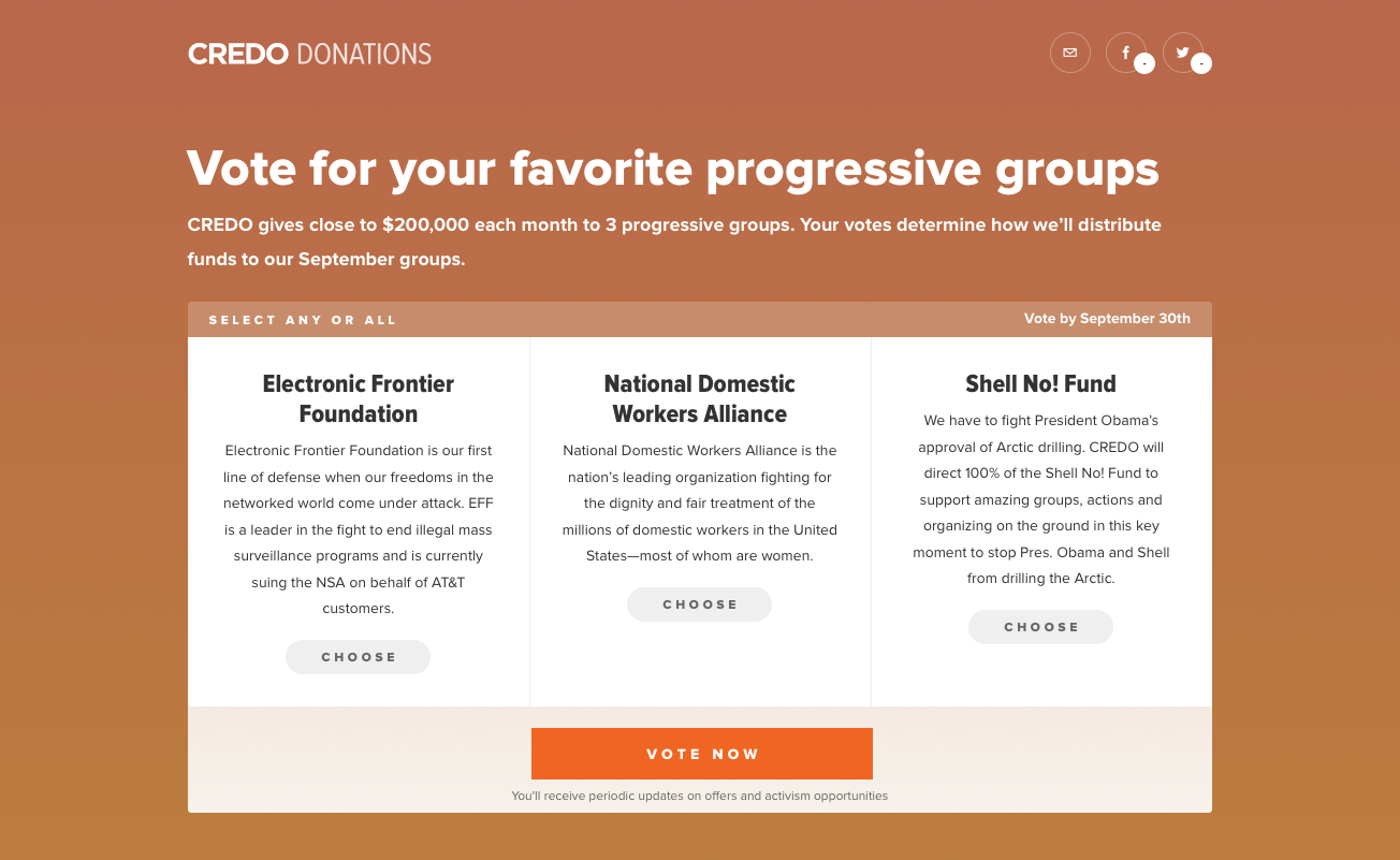 Until September 30, CREDO customers and action members can visit CREDO's ballot website and vote for EFF using their member email address. If you're not a CREDO member, you can still vote by signing up and taking one of CREDO's progressive action petitions. (CREDO Privacy Policy)