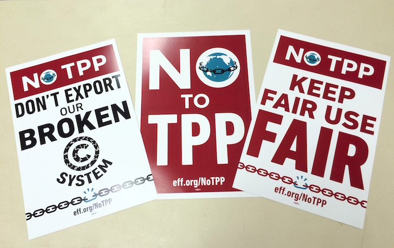 Stay tuned as we develop more materials and resources to spread the word about the TPP's impacts on your digital rights. For now, you can start by taking this action to urge your lawmakers to call a hearing on the contents of the TPP that will impact your digital rights, and more importantly, to vote this deal down when it comes to them for ratification: