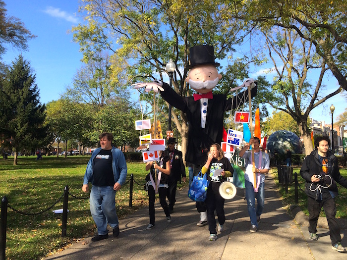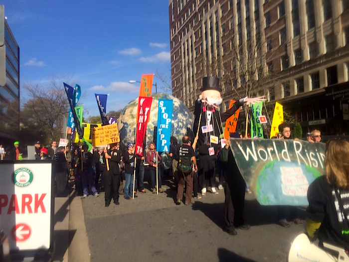 Another rally was held on Tuesday morning, where we marched to each of the TPP country embassies to demonstrate our support of those who have been protesting it in other regions of the world. Protesters carried a 10-foot-tall figure of Mr. Monopoly, which puppeteered the flags of the 12 TPP countries participating countries. Others carried flags with "stop TPP" in all the languages of the TPP countries, and a gigantic globe of the earth on their shoulders to signify our common responsibility for the rights and interests of people and environments worldwide: