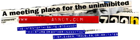 Almost everything on Annoy.com was designed to challenge preconceived notions of decency and annoyance--not for the sake of being obnoxious, but to demonstrate the insanity of the law itself. From the ability to send anonymous communications through postcards and mad-libs, to the unmediated and unfiltered message board/discussion system, the technology itself provided identity management mechanisms that allowed for expression to take place without any fear of repercussions for opinions, or fear of having one's true identity revealed.
