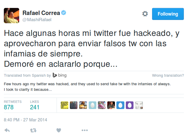 The blocking incident mentioned in the memo occurred the same day that private emails allegedly from Rommy Vallejo, Director of the National Secretariat of Intelligence (SENAIN), were published on blogspot.ca, a blogging platform operated by Google. The blog post includes a YouTube video. The day before, President Rafael Correa claimed that his Twitter account had been hacked.