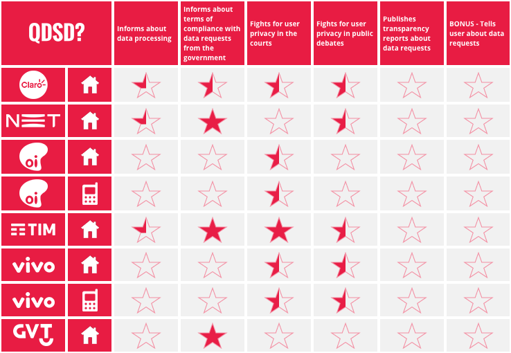 The results show that there is still a lot of room for improvement when it comes to ISPs standing up for user's privacy in Brazil. In general, the contracts and documents which are available to the users are generic and do not provide clear information about practices and circumstances under which user data may be turned over to law enforcement. When it comes to defending user's privacy in court, most of the ISPs seem to have taken steps to challenge laws or question law enforcement practices but there is still much more to be done: TIM was the only company providing evidence that they have challenged abusive requests in court. In terms of taking pro-user privacy public stances, particularly in the recent public consultations regarding the Data Protection Draft Bill and Marco Civil da Internet, companies like GVT and Oi seem to have completely missed the opportunity to stand up for user privacy. The results also indicate a need to work on transparency: none of the ISPs publish transparency reports providing information about data requests or adopt notification policies, giving the user an opportunity to defend the privacy of his/her data. Notification is essential for users to challenge data requests or seek other remedies. Out of the six evaluation categories, TIM earned the most stars (2 and 3/4) and Oi the least (half a star).