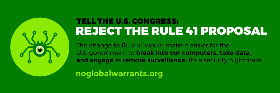 Even if you don’t run a website where you can embed the banner, you can still help. On or before June 21, you can send an email to your member of Congress. Please post about Rule 41 on social media or a blog, and ask your friends to speak out. Feel free to get creative by hosting events in your home community, taking a photo, and sending it our way.