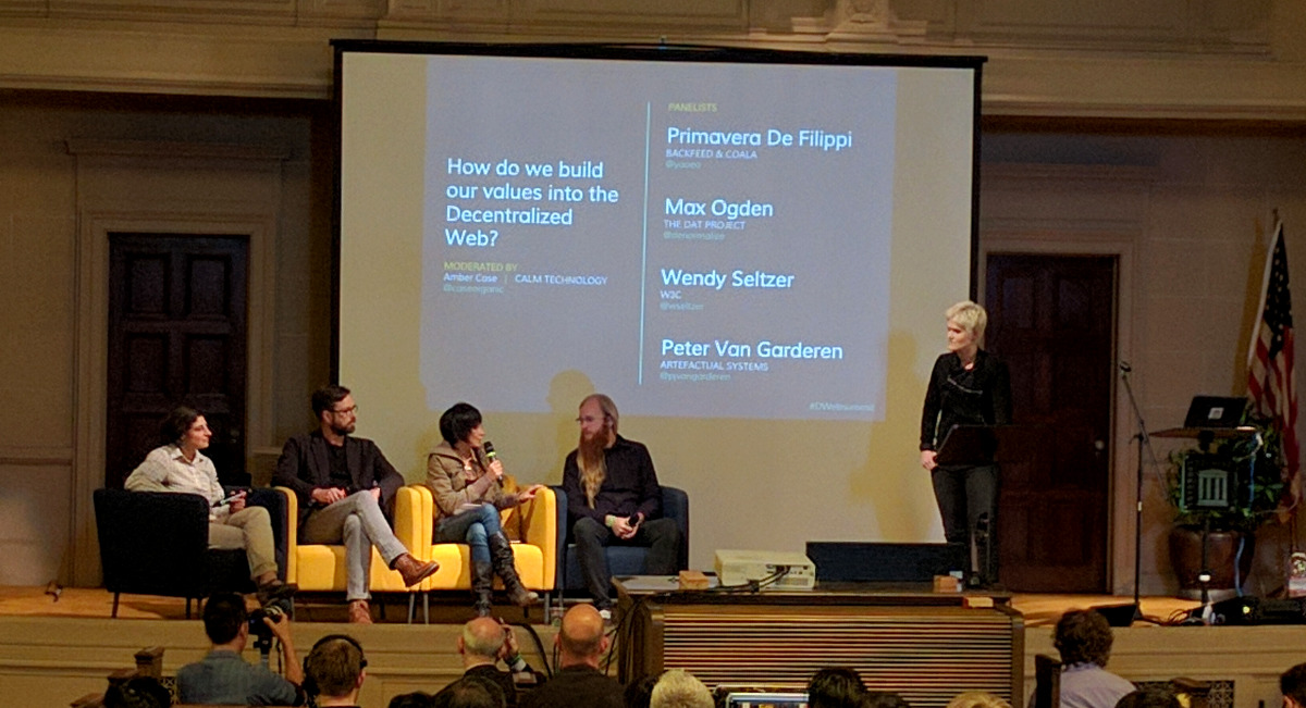 Cory’s talk was followed by a series of panels. The first included Primavera de Filippi (Backfeed & Coala), Max Ogden (The DAT Project), Wendy Seltzer (W3C), and Peter Van Garderen (Artefactual Systems). They discussed in further detail how we can actually carry out Cory’s call to action, and build our values in to the decentralized web, covering everything from decentralized governance systems to how code, norms, markets, and the law interact to affect our lives.