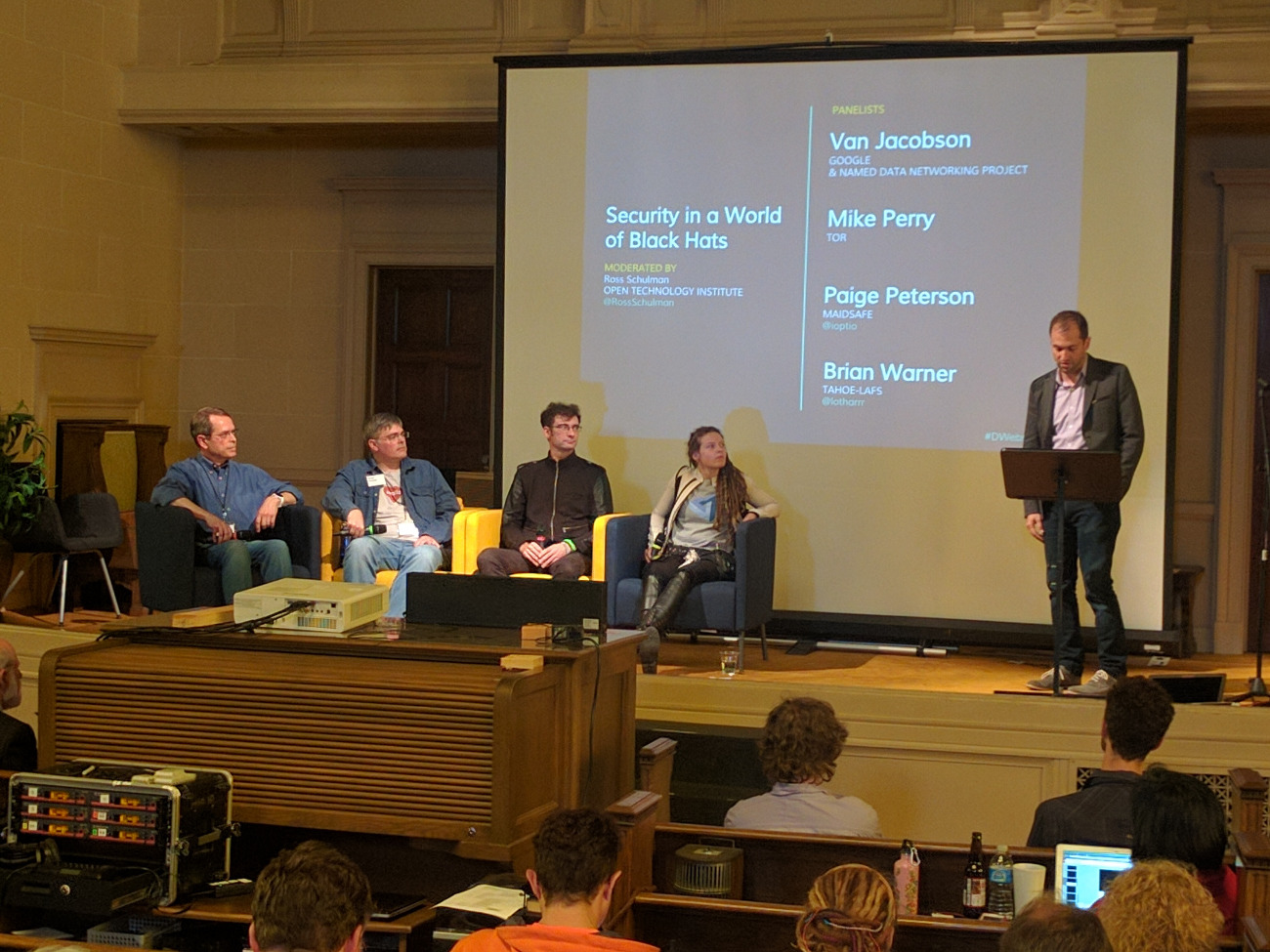 The second panel focused on security for the decentralized web, and included Van Jacobson (Google and Named Data Networking Project), Mike Perry (Tor), Paige Peterson (MaidSafe), and Brian Warner (Tahoe-LAFS). They covered familiar ground when it comes to computer security, talking about threat modeling, red-teaming, and how one of the things they’re most concerned about when it comes to the security of the systems they build is attacks on developers in order to reach end users.