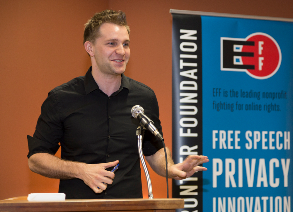 EFF International Director Danny O’Brien presented the next award to Max Schrems. O’Brien pointed out that Schrems was often described in media reports “with a slight tone of dismissal” as an “Austrian law student. How could he possibly believe he was right” in challenging Facebook and the mighty tech industry? Schrems had the audacity to ask companies, “What are you doing to comply with EU data protection law?” Today Schrems can be rightly described in the media as a “noted jurist and successful litigant,” O’Brien said.