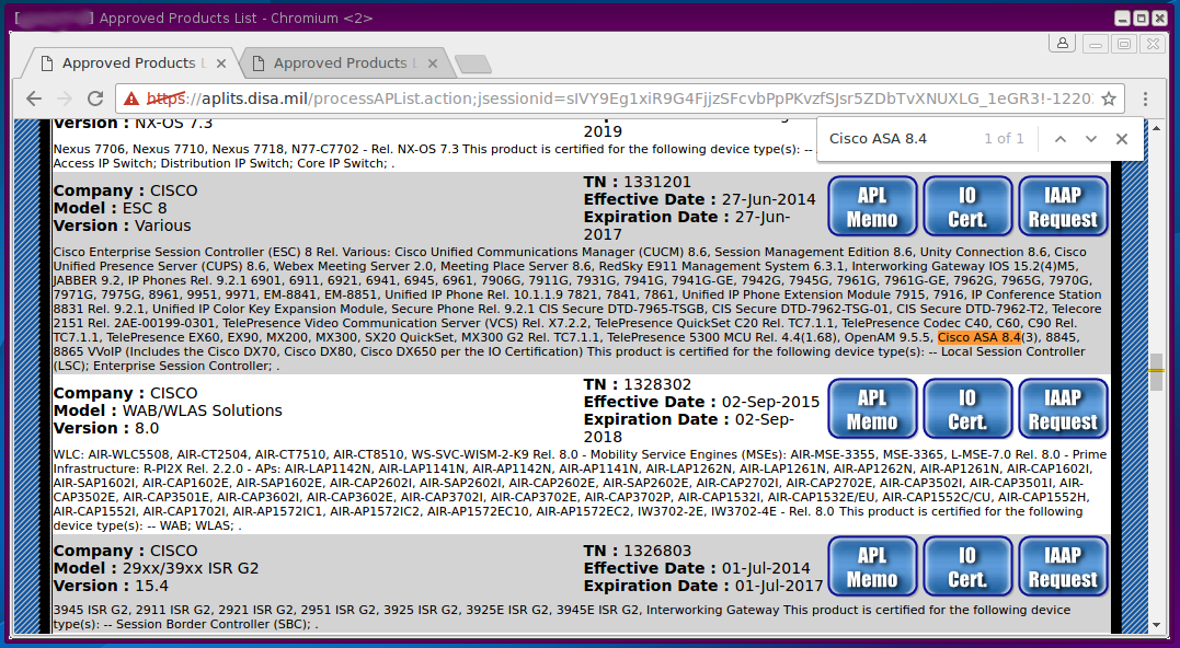 - 1. We have chosen not to directly link to the APL here for technical reasons. The Department of Defense uses its own Certificate Authority (CA) for authenticating websites, which is not trusted in browsers. We provide the url here as a convenience, but recommend strongly against adding additional CAs to your browser: https://aplits.disa.mil/processAPList.action