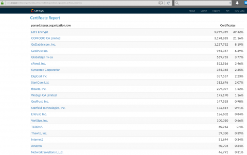 By other metrics, Let’s Encrypt is in fact the CA that has issued the most certificates and protected the most sites. This ranking from the Censys project looks at all known certificates that are valid, unexpired, and would be accepted by browsers at the moment of the query: