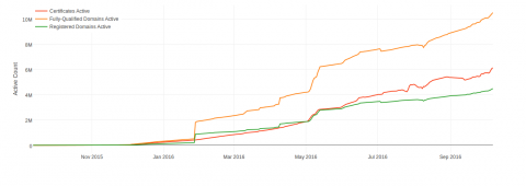Some of these un-expired certificates are duplicates, with more than one certificate covering one domain name. Others are the opposite, covering many domain names under one certificate.3 So it's probably more accurate to look at the number of distinct domains covered by unexpired certs. “Fully-qualified domains active” in orange shows the number of different names among non-expired certificates. For example, www.eff.org and supporters.eff.org are treated as two different names. This metric can overcount sites; while most people would say that eff.org and www.eff.org are the same website, they count as two different names here.