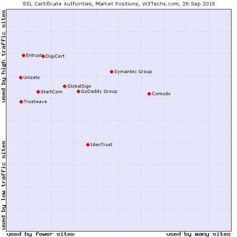 CAs in the lower part of the graph tend to serve more low-traffic sites. Source: W3Techs.