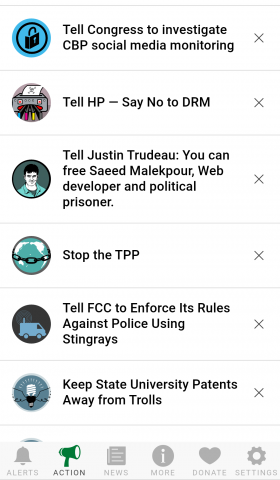 The first EFF Alerts app was really simple, allowing push notifications that let you know when your rights are in jeopardy. The new version of the app does this and more. We’ve added a beautiful interface for accessing the EFF Deeplinks blog. We also gave users the option of accessing all of the available action alerts, and dismissing actions they didn’t want to see anymore. You can also go into settings and turn off push notifications.