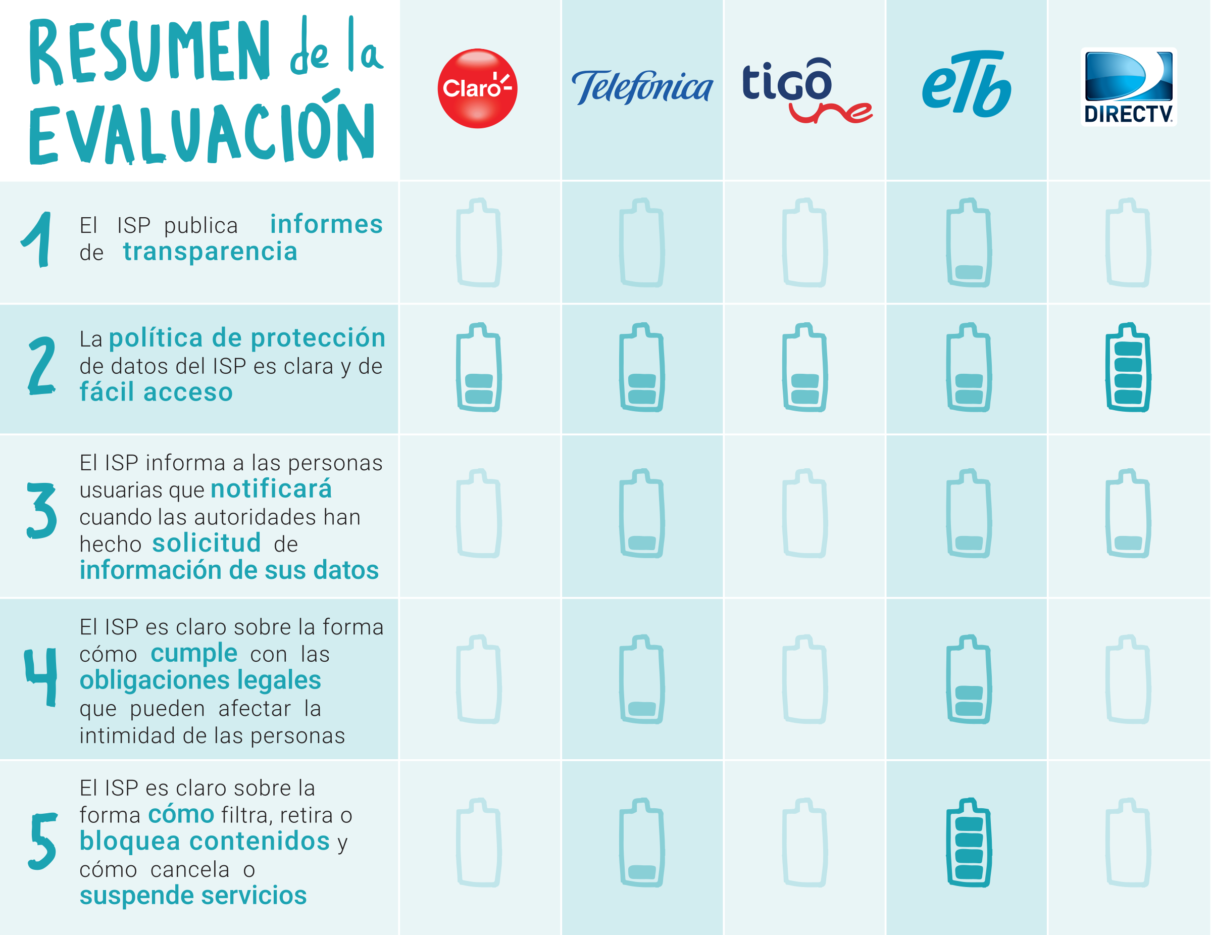 The report shows that Colombian telecommunication companies have not yet stepped up to meet tech industry best practices related to privacy and transparency reporting. Nonetheless, two key members of Colombia’s telecommunications industry—ETB and Telefónica-Movistar—have improved their practices, with ETB leading the way.