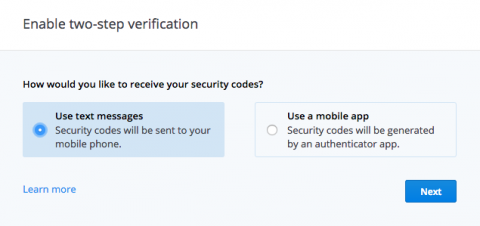 Now you have a choice between using text messages or an authenticator app as your primary 2FA method. Using text messages is selected by default. Authenticator apps are more secure and avoid a lot of the downfalls of SMS. However, text messages can be more practical if you do not use a smartphone. Consider your threat model and choose the best mode for you.