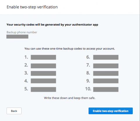 Finally, you’ll get backup or recovery codes. Write these down or print them and keep them in a safe place. Click “Next” and you’re finished.