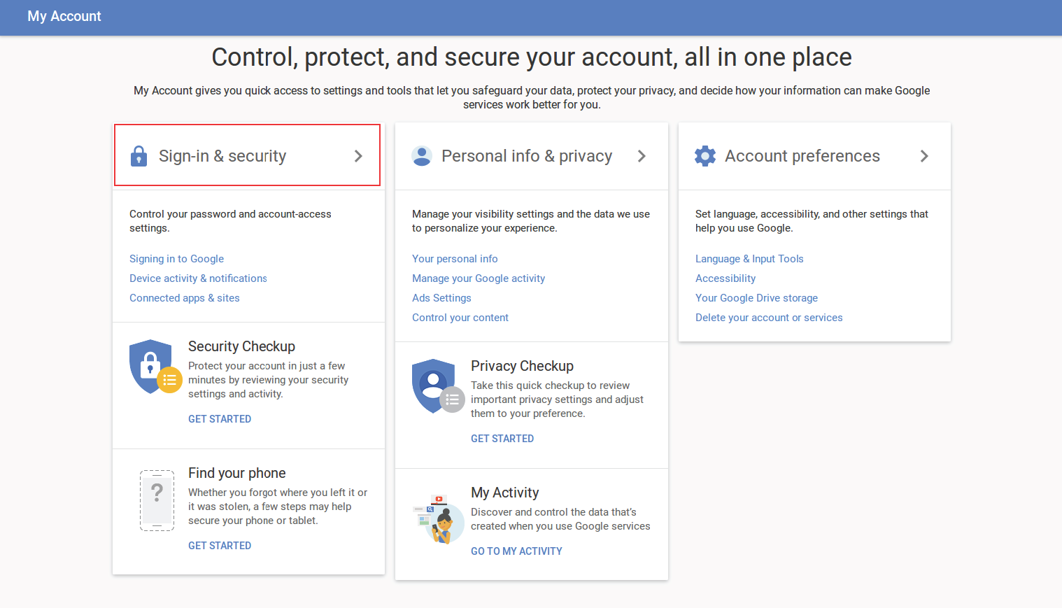 Click on your profile picture in the upper-right hand corner and click “My Account.” From your account page, choose “Sign-in & security.”