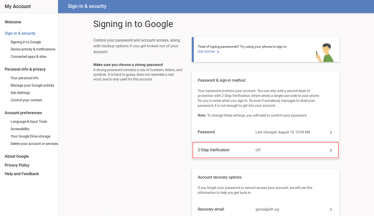 Select “2-Step Verification” under “Password & sign-in method.”