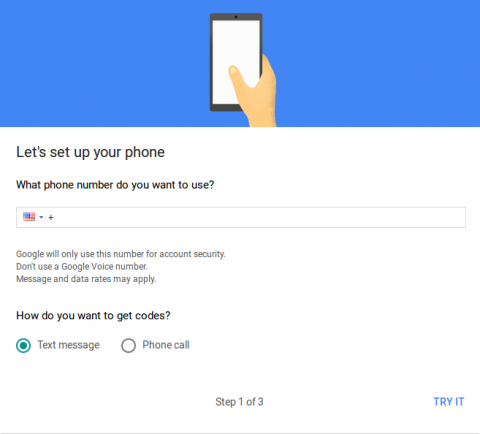 Enter your mobile phone number. You’ll need to be able to receive text messages and/or voice calls at this number. Choose which you’d prefer and click “Try it.”