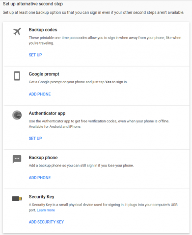 Now you’ll be back at Google’s 2-Step Verification settings page, where you can set up an “alternative” second factor in case you cannot receive texts/calls. Keep in mind that the general default option of receiving codes via SMS is vulnerable to interception by your telecom and others and is less secure than other available methods. Google’s Authenticator app is one popular choice: it generates free, one-time passwords and is supported by a range of services, including Facebook, Dropbox, and Microsoft.