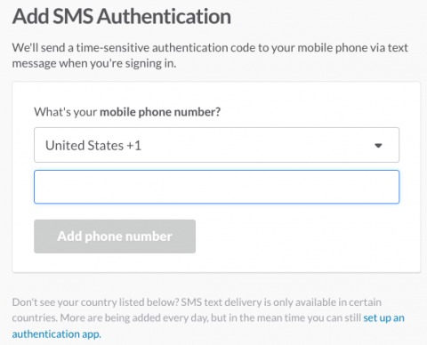 If you choose to use text messages, select “SMS Text Message.” Enter a phone number at which you can receive texts and click “Add phone number.”