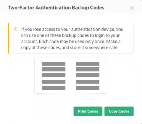 Before returning to your settings page, you’ll get your backup codes. Print or copy them and keep them in a safe place.