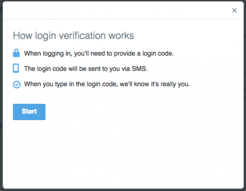 The first prompt briefly describes how 2FA works on Twitter. Click “Start.”