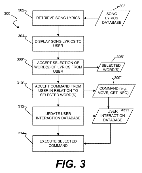 The patent dates back to an application filed in February 2011. Although it is 23 columns long, in our view the patent does not describe any software or Internet technology that was remotely new or innovative at that time. Rather, it describes common and mundane features, such as a “menu of options,” “user-inputted text” and a “user interaction database,” and applies these features to a lyrics website. That should not be enough to get a patent.