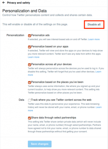 Instead, concerned users have to click “Review settings” to opt out of Twitter’s new mechanisms for user tracking. That will bring you to the “Personalization and Data” section of your settings. Here, you can pick and choose the personalization, data collection, and data sharing you will allow—or, click “Disable all” in the top-right corner to opt out entirely.