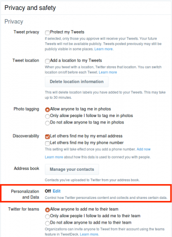 Twitter has stated that these granular settings are intended to replace Twitter’s reliance on Do Not Track. However, replacing a standard cross-platform choice with new, complex options buried in the settings is not a fair trade. Although “more granular” privacy settings sound like an improvement, they lose their meaning when they are set to privacy-invasive selections by default. Adding new tracking options that users are opted into by default suggests that Twitter cares more about collecting data than respecting users’ choice.