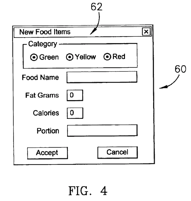 The application for Dynamic Nutrition’s patent was filed on June 11, 2001. By that time, computers had been around for decades and there was nothing remotely surprising or innovative about programing a computer to keep track of data—whether it be nutrition data or units shipped or accounts receivable or whatever. Nevertheless, the Patent Office takes an extremely rigid approach to whether or not a patent application is obvious. This means that companies often get patents on common sense ideas (like taking photos against white background or filming a yoga class).