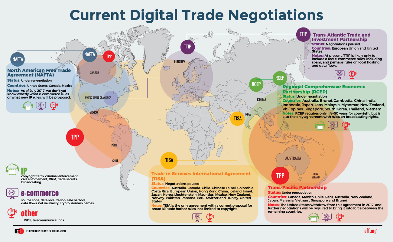 Keep reading Deeplinks for updates on the progress of each of these trade agreements, and how they will affect you. And if you'd like to support our difficult work in fighting for users' rights in all of these secretive venues, you can help by donating to EFF.