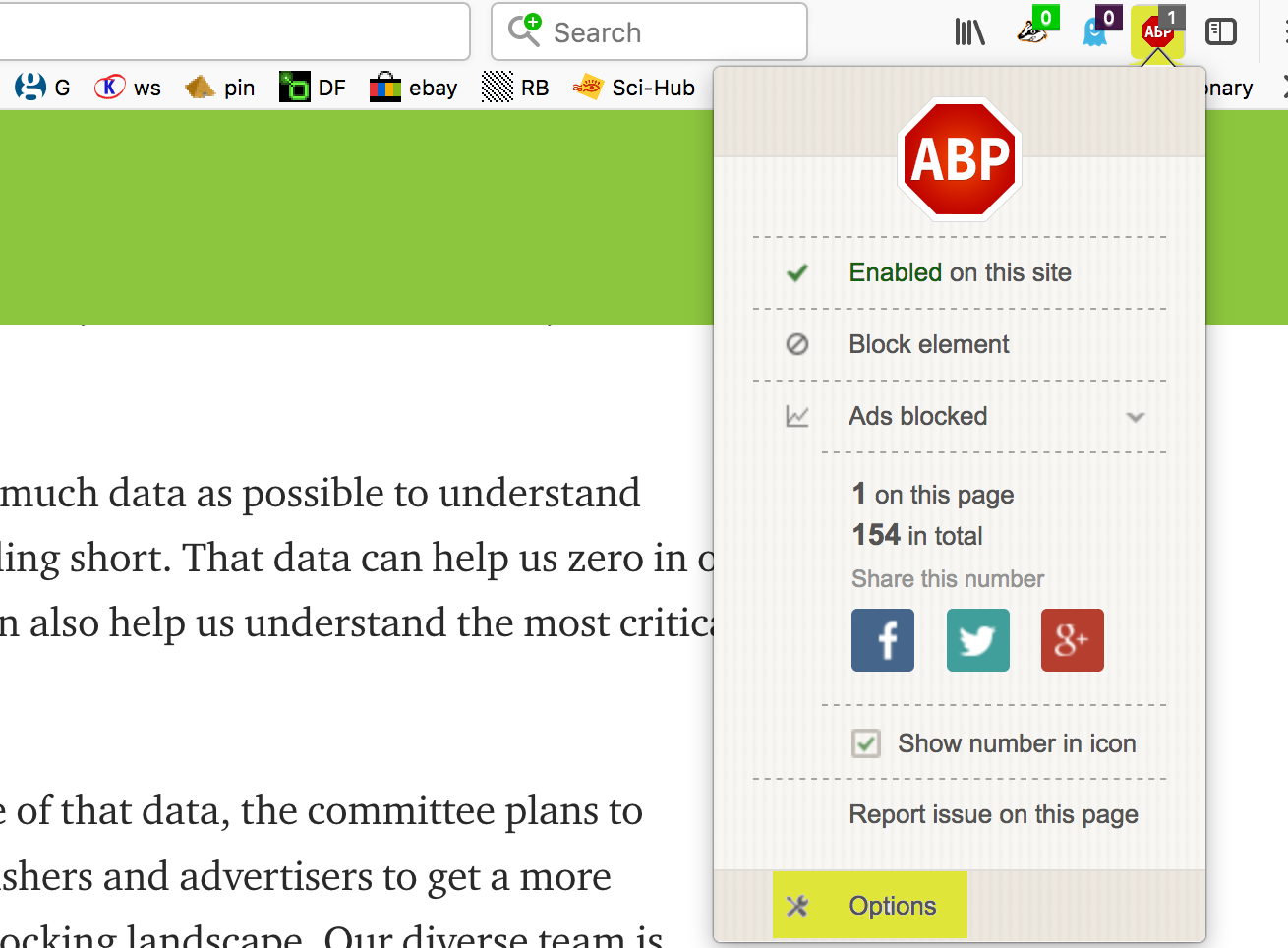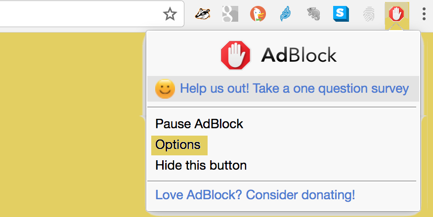 1. Click on the ABP icon in the top right-hand corner of the browser window. This will open an interface menu. Select Options at the bottom.