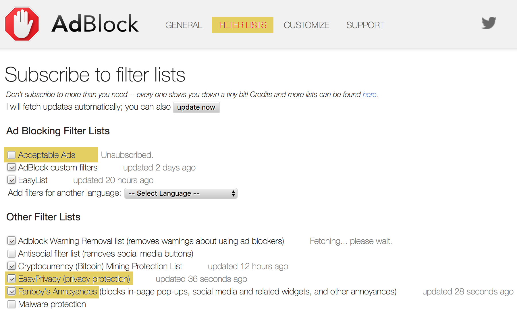 3. Next, navigate to Filter Lists. Uncheck the box marked Acceptable Ads. Then, go down to the bottom and check EasyPrivacy and Fanboy's Annoyances. EasyPrivacy blocks invisible trackers which are loaded regardless of whether ads are blocked. Fanboy's Annoyances list replaces widgets such as the Facebook like button that send information back to their owners whenever they are loaded on a web page.