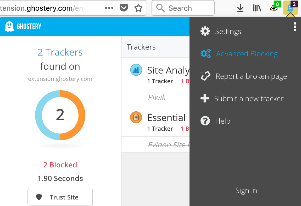 1. Click on the Ghostery icon in the top right hand corner of the browser. An interface will appear. Select the second option, Advanced Blocking.
