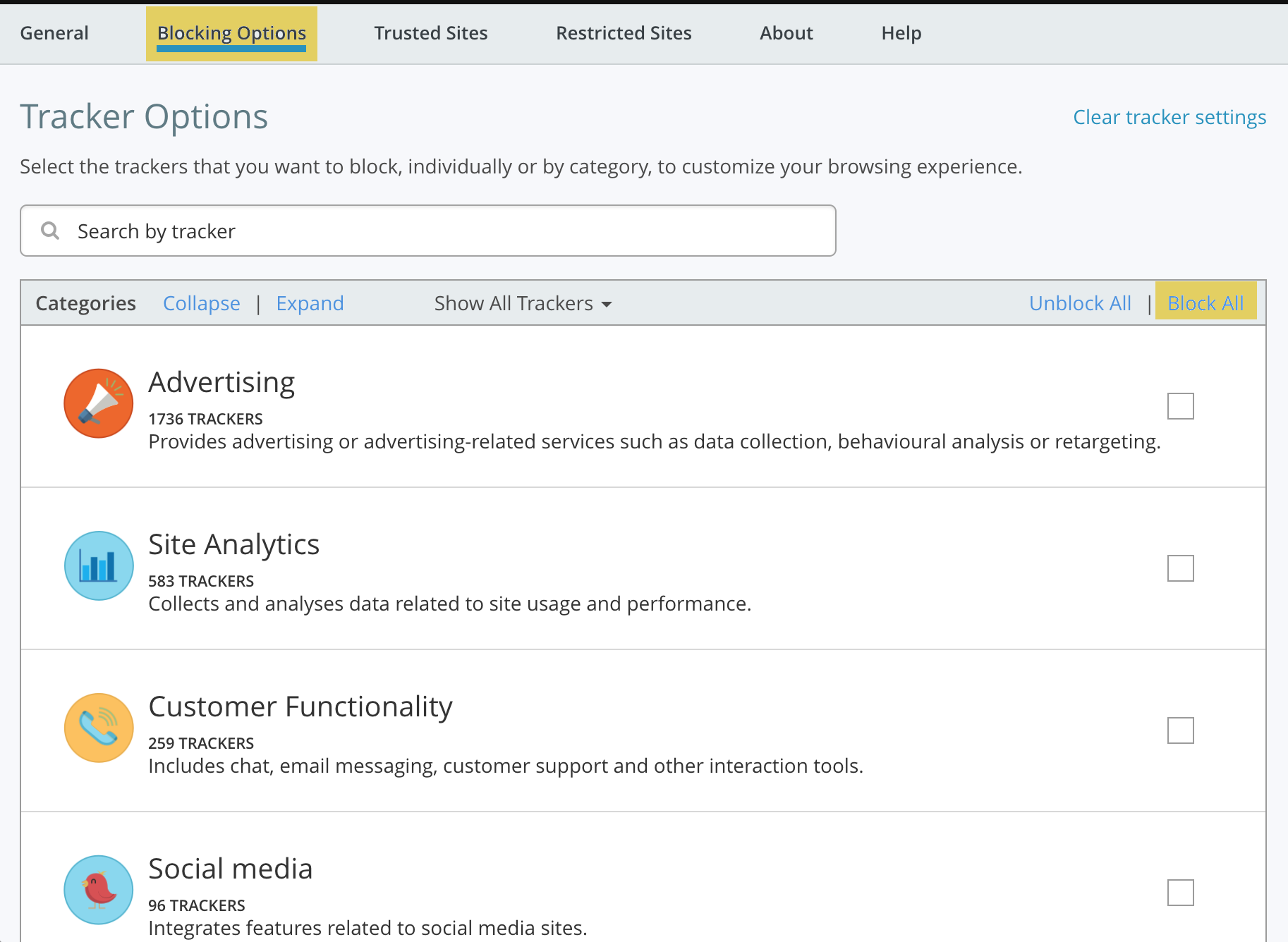 2. You are now in the Blocking Options section of the Settings. You can see the categories which Ghostery uses to classify trackers: Advertising, Site Analytics etc. Above the check boxes on the right, select the Block All option.