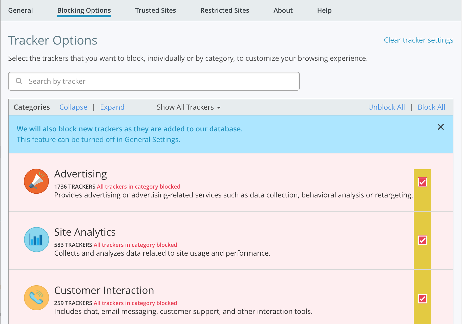 3. The checkboxes for every category of tracker should now be ticked. In addition, you should see a message stating that any additional trackers identified by Ghostery in the future will be blocked automatically.