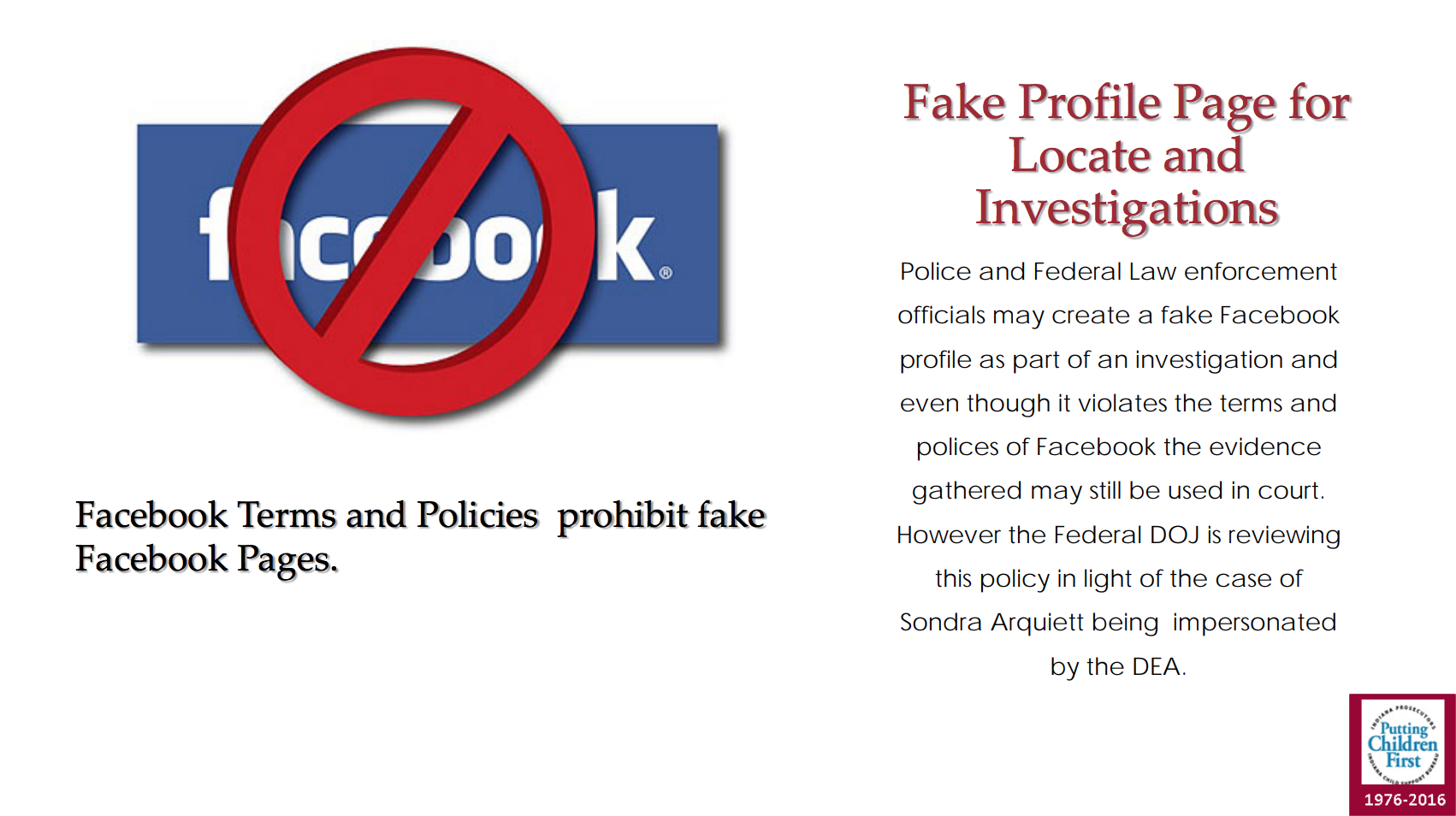 The presenter told the audience: “Police and Federal law enforcement may create a fake Facebook profile as part of an investigation and even though it violates the terms and policies of Facebook the evidence may still be used in court.”
