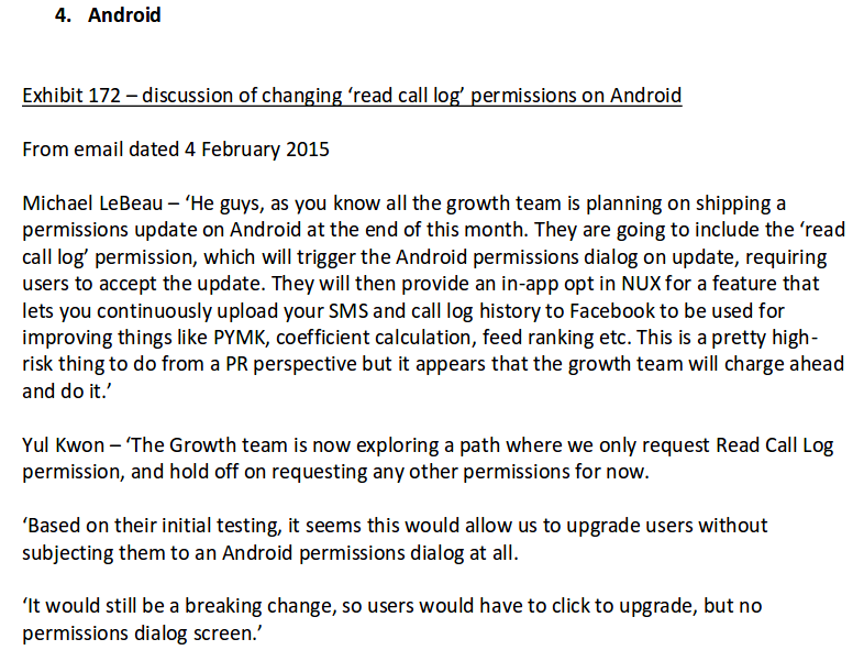 This kind of disregard for user consent around phone number and contact information recalls earlier research and investigation exposing Facebook’s misuse of users’ two-factor authentication phone numbers for targeted advertising. Just as disturbing is the mention of using call and text message history to inform the notoriously uncanny PYMK, or People You May Know, feature for suggesting friends.