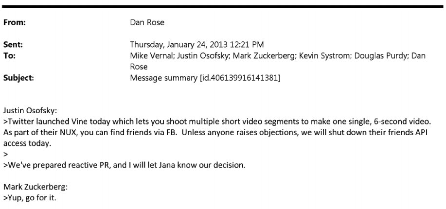 Both before and after Facebook’s API changes, the documents indicate that the company deliberately granted or withheld access to data to undermine its competitors. In an email conversation from January 2013, one employee announced the launch of Twitter’s Vine app, which used Facebook’s Friends API. The employee proposed they “shut down” Vine’s access. Mark Zuckerberg’s response?